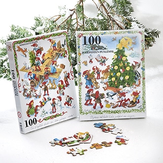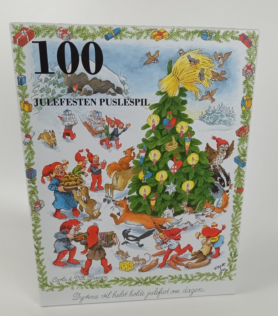 Puslespil med 100 brikker med motiv fra Nissernes Jule af Carla og Vilhem Hansens tegninger.