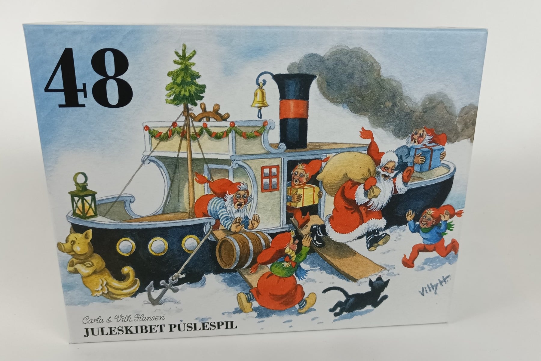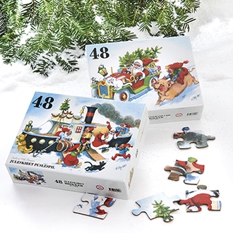 Puslespil med 48 brikker med motiv fra Nissernes Jule af Carla og Vilhem Hansens tegninger.
