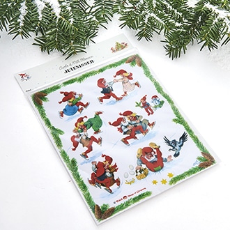 Vindues stickers med sjove nisser fra Nissernes Jul, som er tegnet af Carla og Vilhem Hansen.