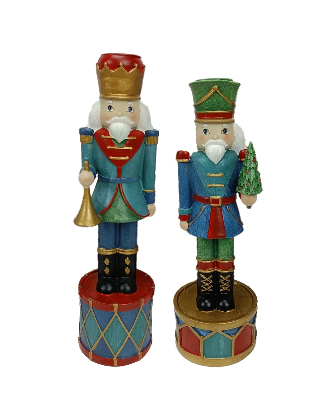 Den ene nøddeknækker med trompet i hånden, den anden med juletræ.