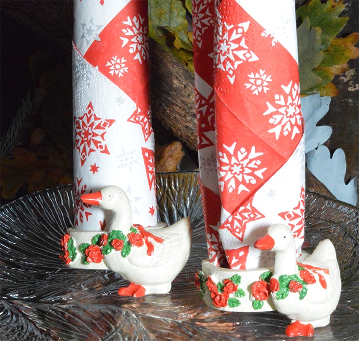 Disse flotte og sjove serviet ringe, er med julegæs som har en flot julekrans rundt om halsen.