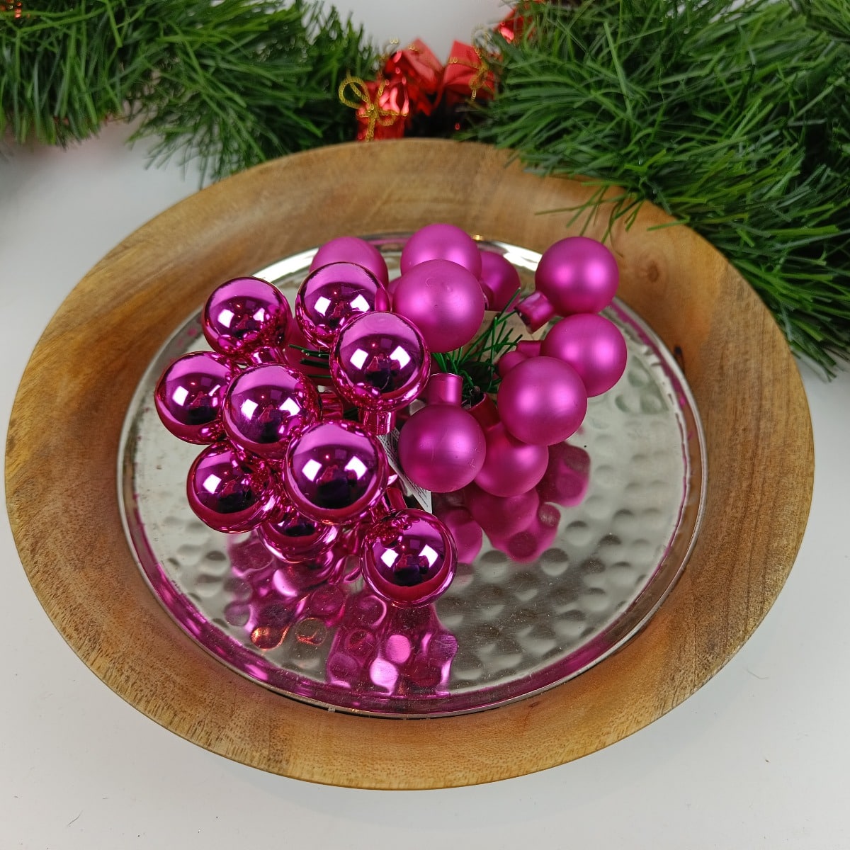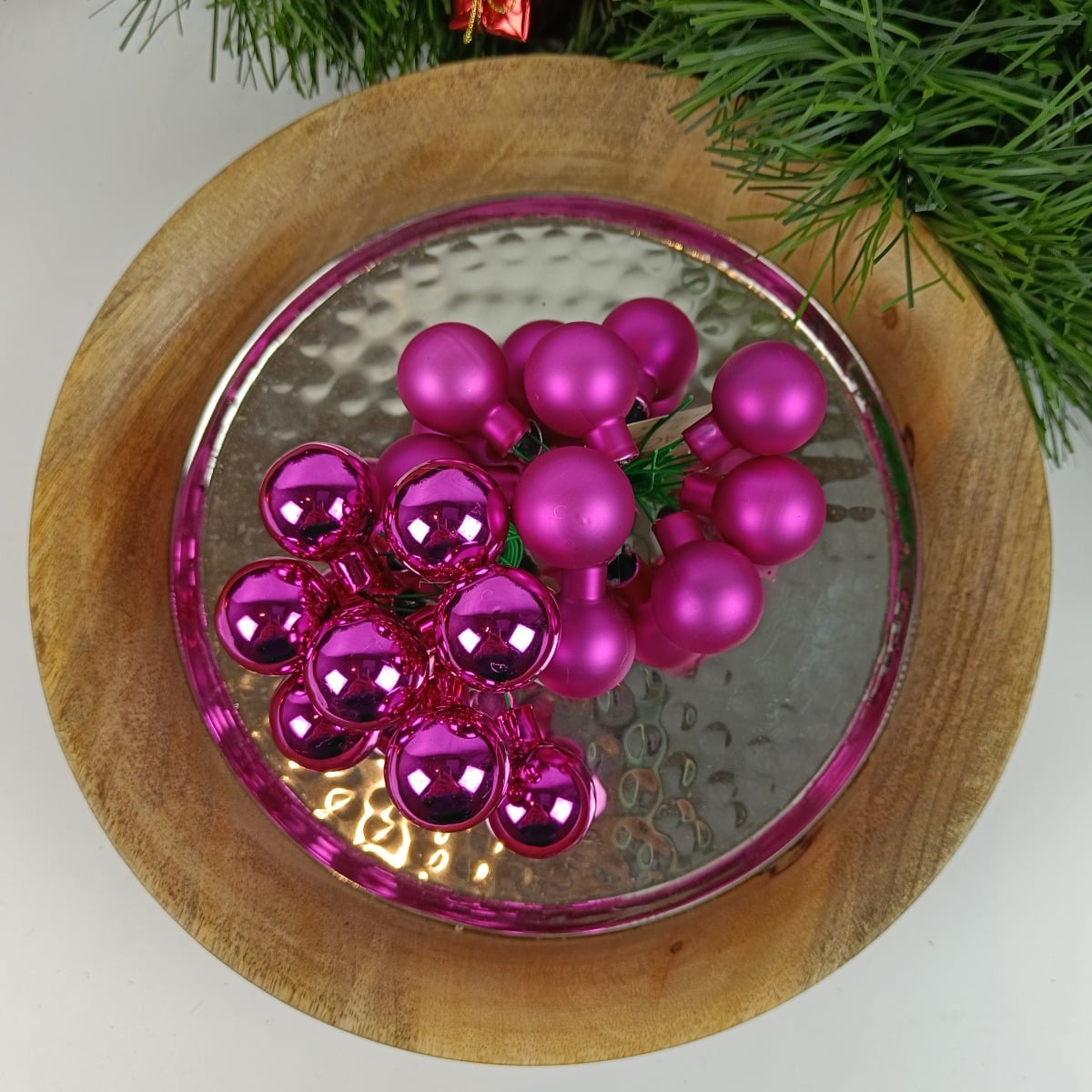 Silkematte og blanke pink glas juletræs kugler i Ø 2,5 cm med stål tråd til dekorationer, kranse, juletræet mm.