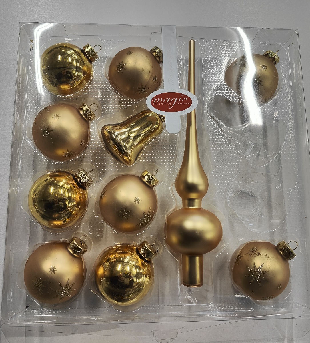 Sættet består i guld silkemat spir, guld silkematte kugler med stjerne dekor, guld klokker, og guld højglans kugler