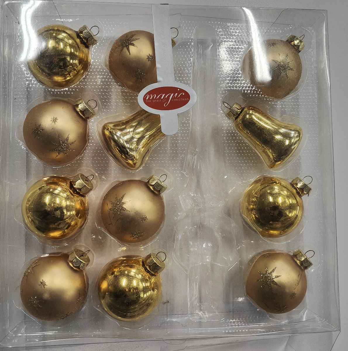 Guld spir mix i silkemat og højglans glas juletræskugler, er juletræskugler i mundblæst glas. Guld spir mix i silkemat og højglans juletræs glaskugler, 13 dele. Helt unikke og smukke guld spir sortiment i silkemat og højglans, i en høj eksklusiv kvalitet. Sættet består i guld silkemat spir, guld silkematte kugler med stjerne dekor, guld klokker, og guld højglans kugler Farve: Guld silkematte og højglans glas juletræskugler. Prisen er pr. æske Restsalg, og der mangler 1 stk spir