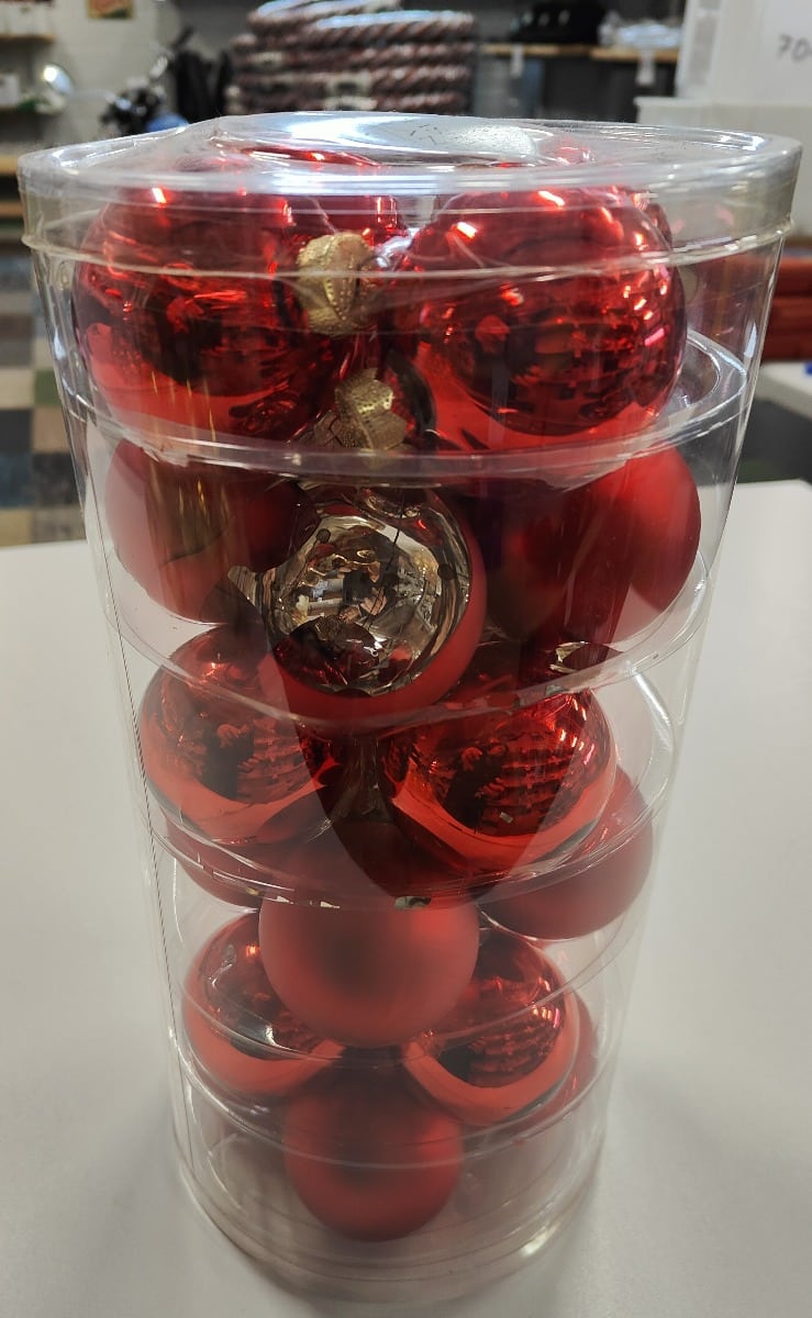 Røde silkematte og blanke juletræskugler i glas til juletræet.