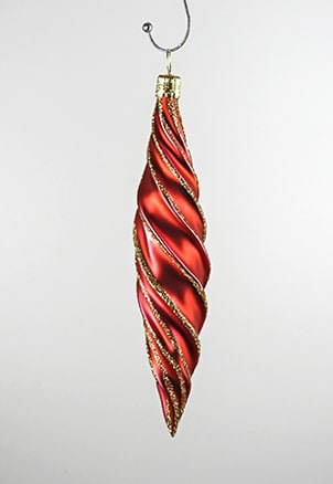 Rød snoet dråber juletræskugler 14 cm, dekoreret med tynd guld glimmer, på en rød silkemat bund.