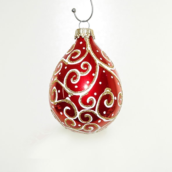 Røde blanke dråbeformet juletræs glaskugler. Smukke røde højglans mundblæste juletræskugler, formet som dråber. Dekoreret med smukt hvidt og guld mønster, Ø 7 cm.