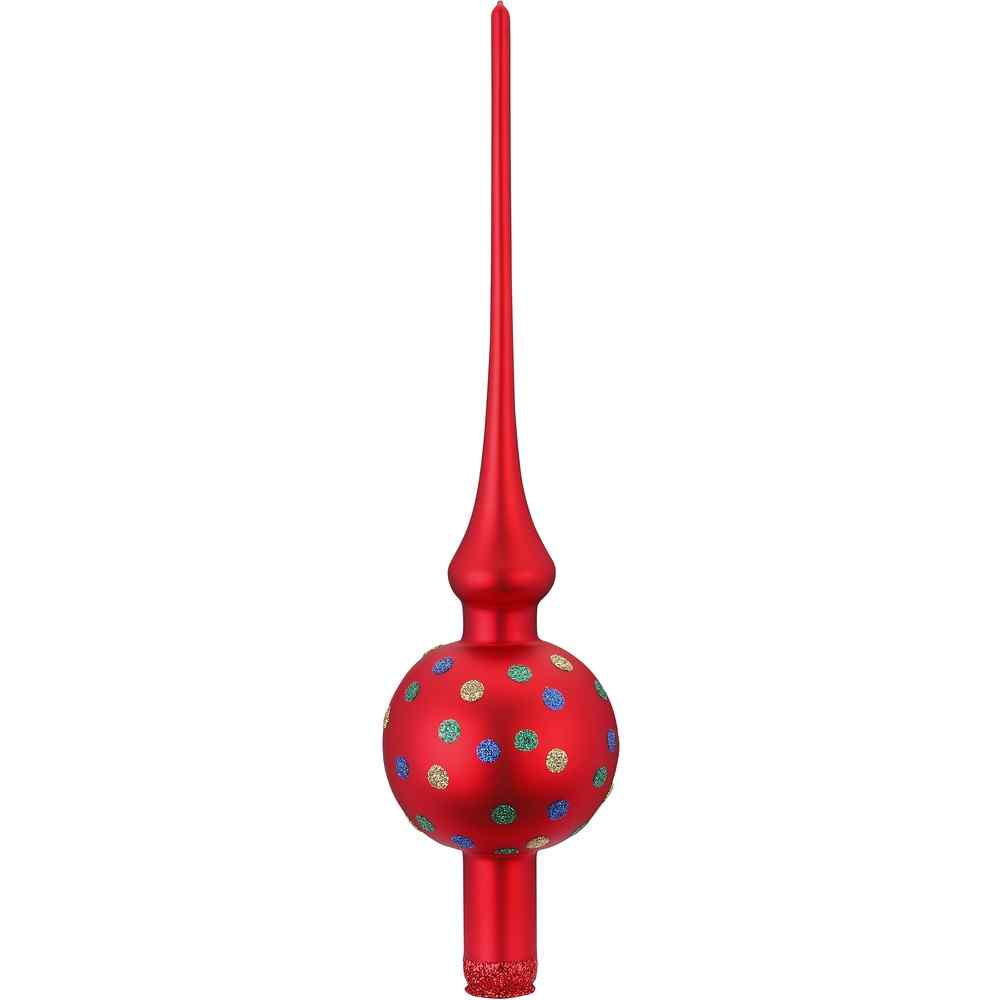 Rød silkemat juletræspir med prikker, er i mundblæst glas og flotte prikker i grøn, blå og guld. Smukt håndlavet rød juletræspir, som er 30 cm høj.