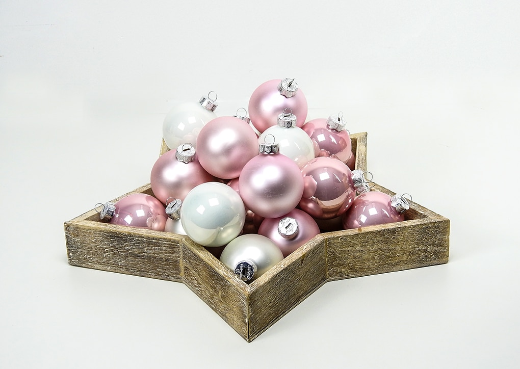 Rosa og hvide juletræskugler mix Ø 6 cm. Silkematte og blanke opal glas julekugler. Gode at sammensætte med andre farver.