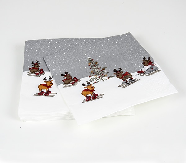 Servietter med sjovt rensdyr landskab. Flotte servietter, med nostalgisk udseende. Sjove rensdyr, der står på ski, og kælker.