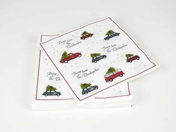 Servietter med vw busser med juletræer. Flotte servietter, med nostalgisk udseende. Gamle vw busser, med juletræer på taget.