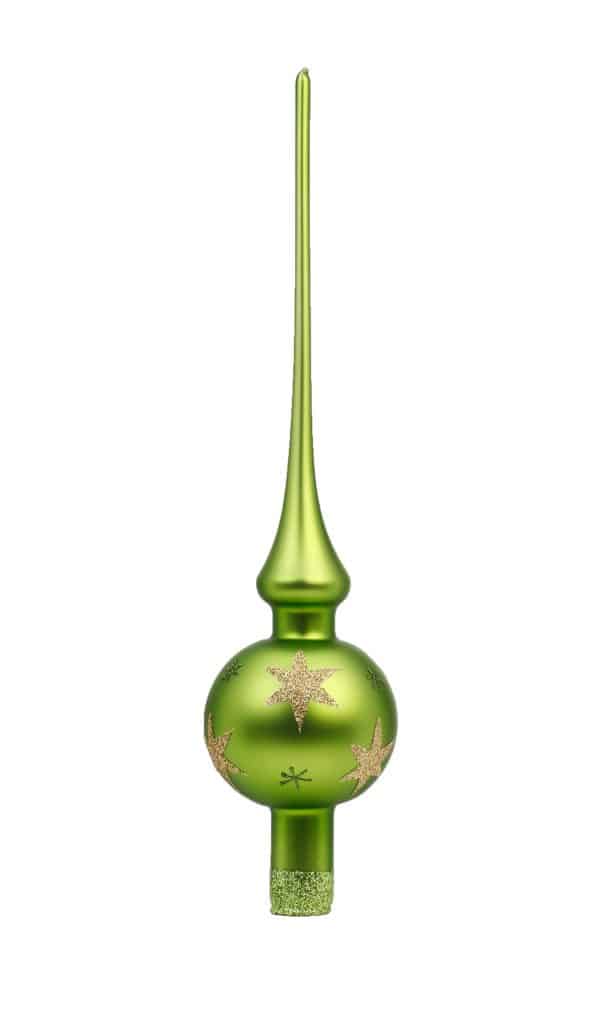 Silkemat grønt spir juletræstop med stjerner 30 cm , dekoreret med stjerner i guld. Smuk og unik juletræ spir – top i mundblæst glas og hånddekoreret.