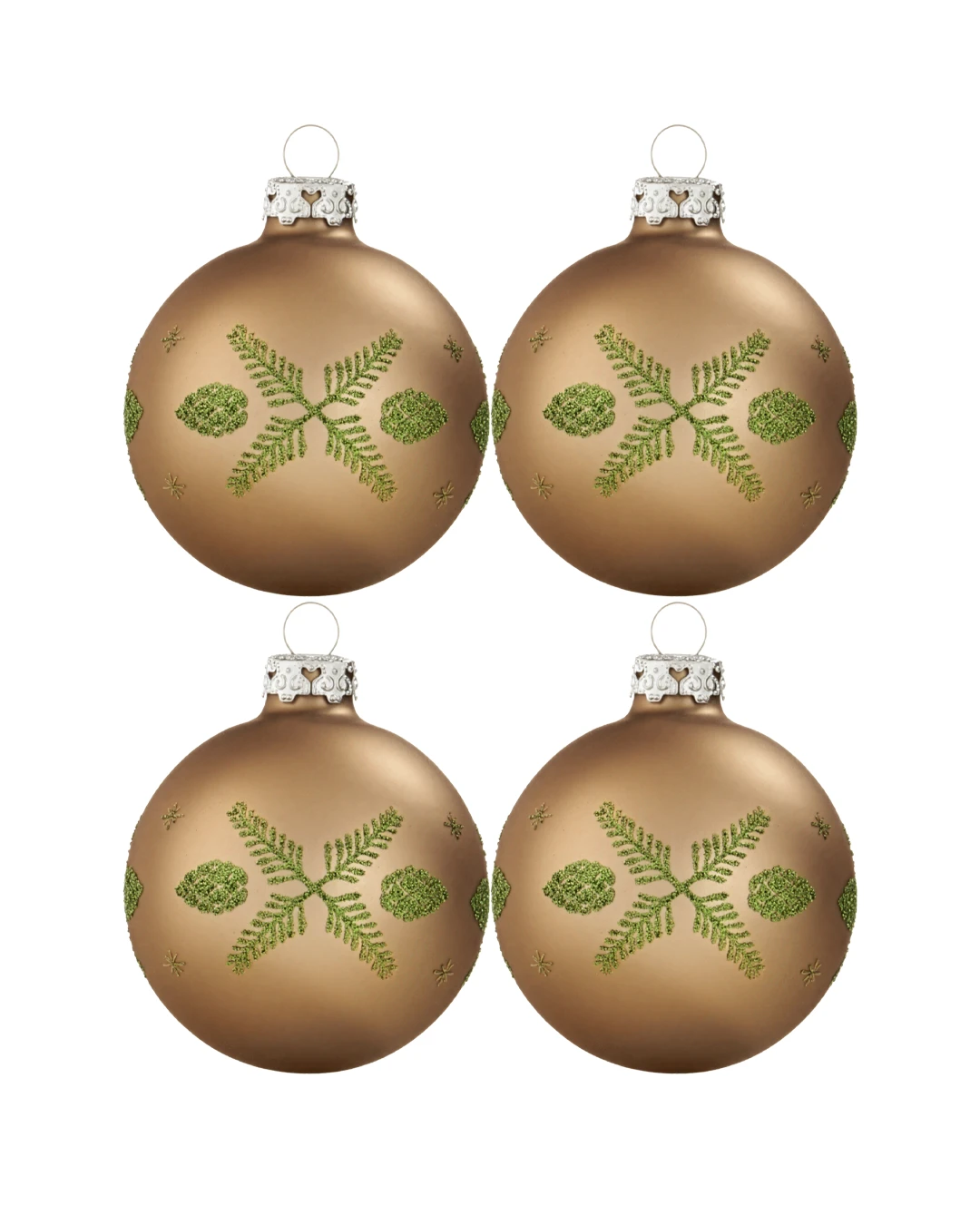 Sættet består af 4 stk silkematte kobber julekugler med olivengrøn grangrene og kogler.