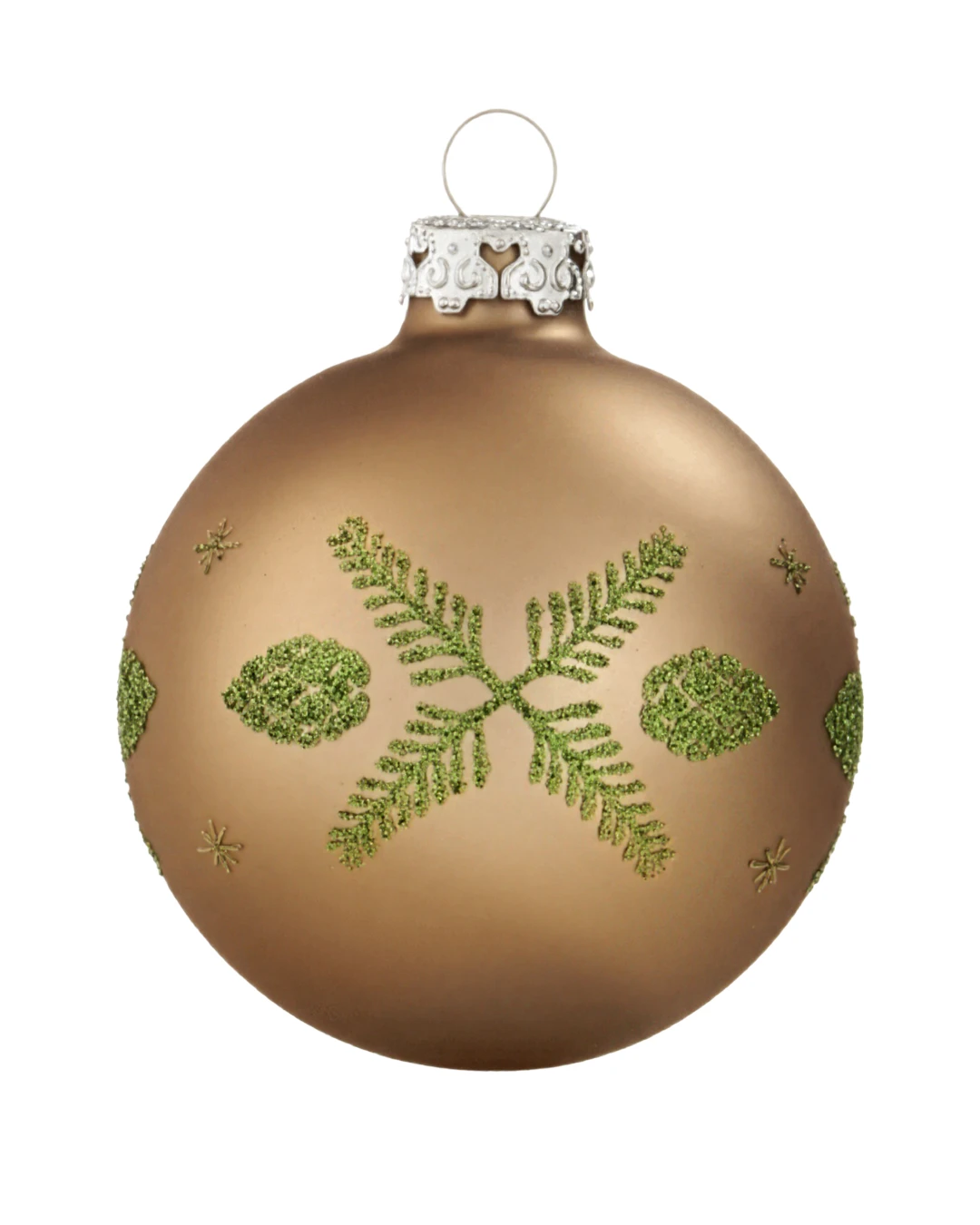 Denne julekugle i silkemat kobber med olivengrønne grene og kogler står smukt ind til de mange andre specielle julekugler.