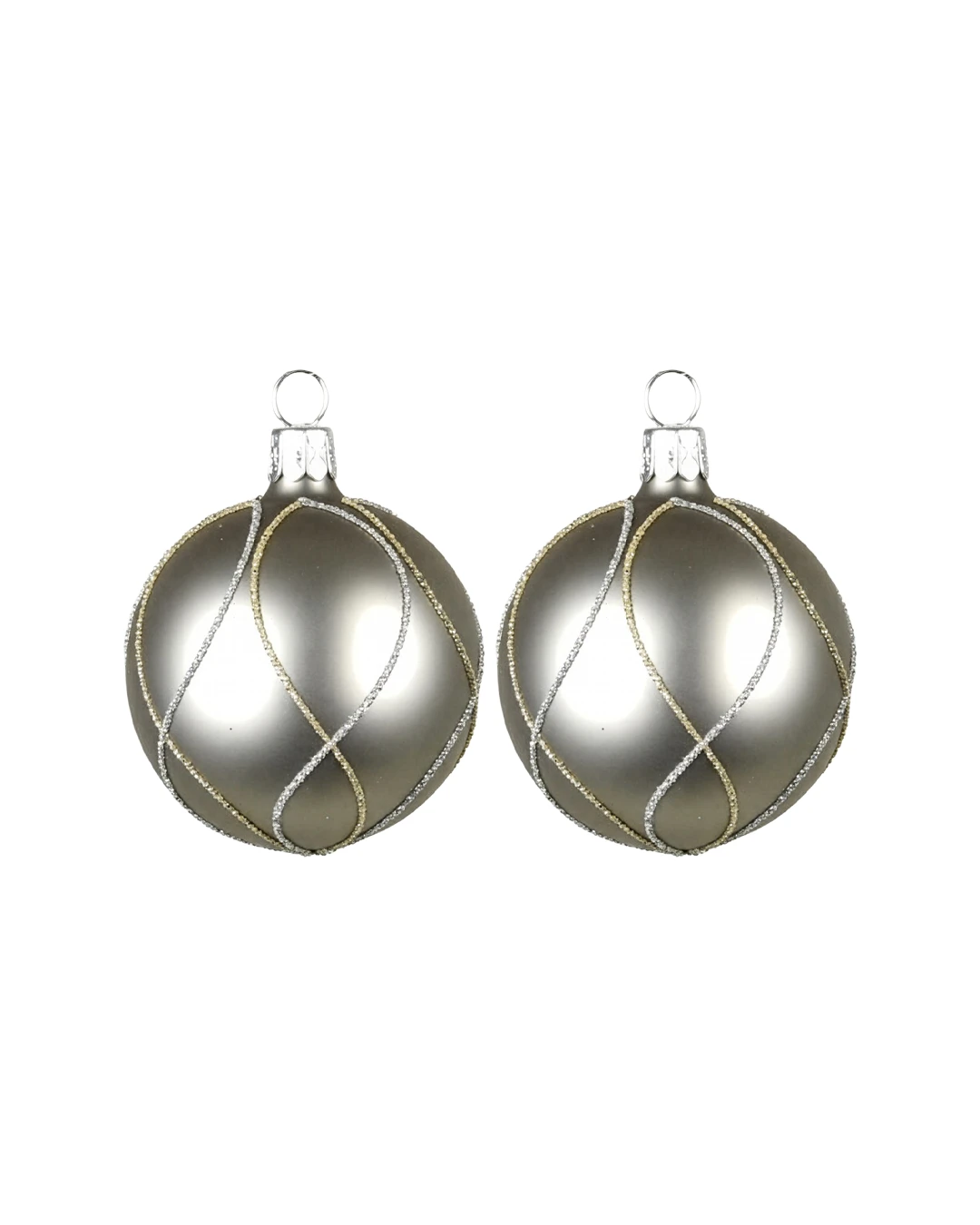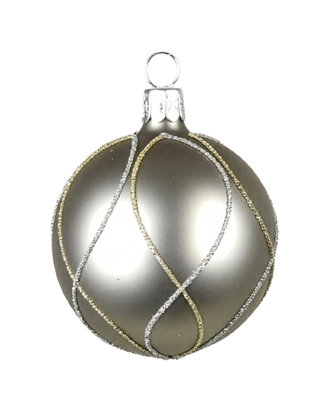 Silkemat sølv juletræskugle med sølv og guld, er i mundblæst glas. Juletræskugle i silkemat sølv, tynde streger i guld og sølv glimmer, hjerteformet. Fantastisk smuk.
