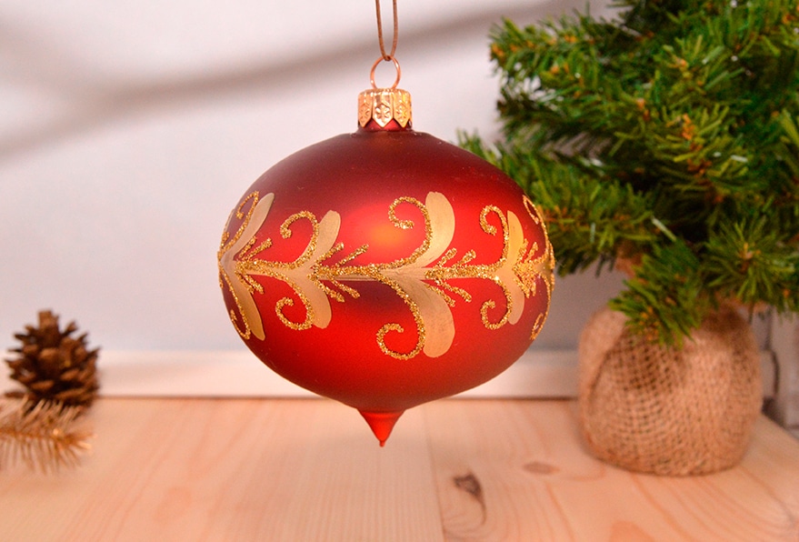 Sjældne røde løgformet glaskugle, med et smukt bælte i guld dekor Juletræs kuglerne er mundblæste og hånddekoreret.