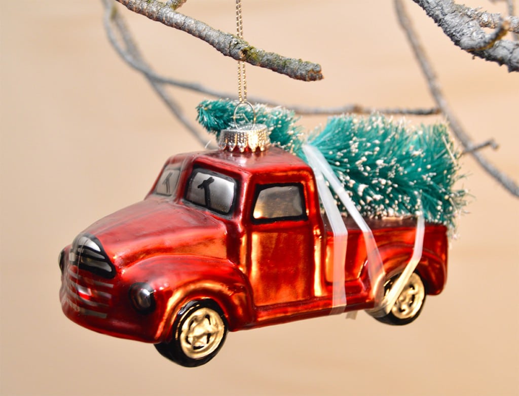 Smuk rød pickup med træ på ladet, som jule kugle, en sjov ting i utrolig flotte farver.