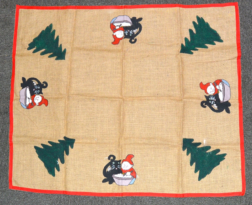 Fint firkantet juletræstæppe, med de søde nisser, der deler risengrøden med katten, og juletræer.