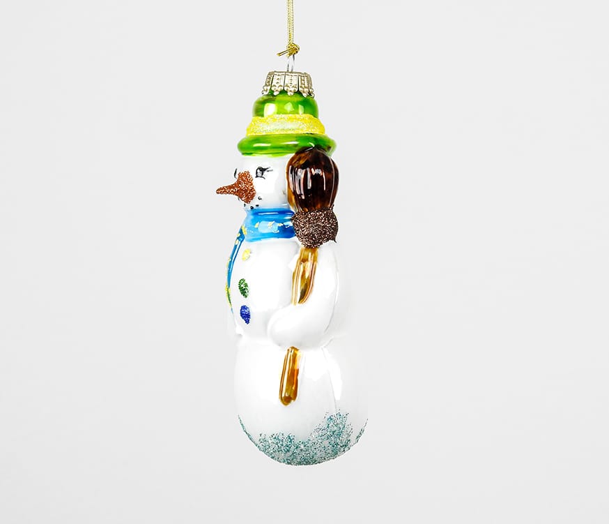 Snemand hvid opal juletræskugle 13 cm. Smukke snemand i hvid opal glas juletræs kugle i mundblæst glas, turkis tørklæde og limefarvet hue, passer godt til de hvide opal kugler.