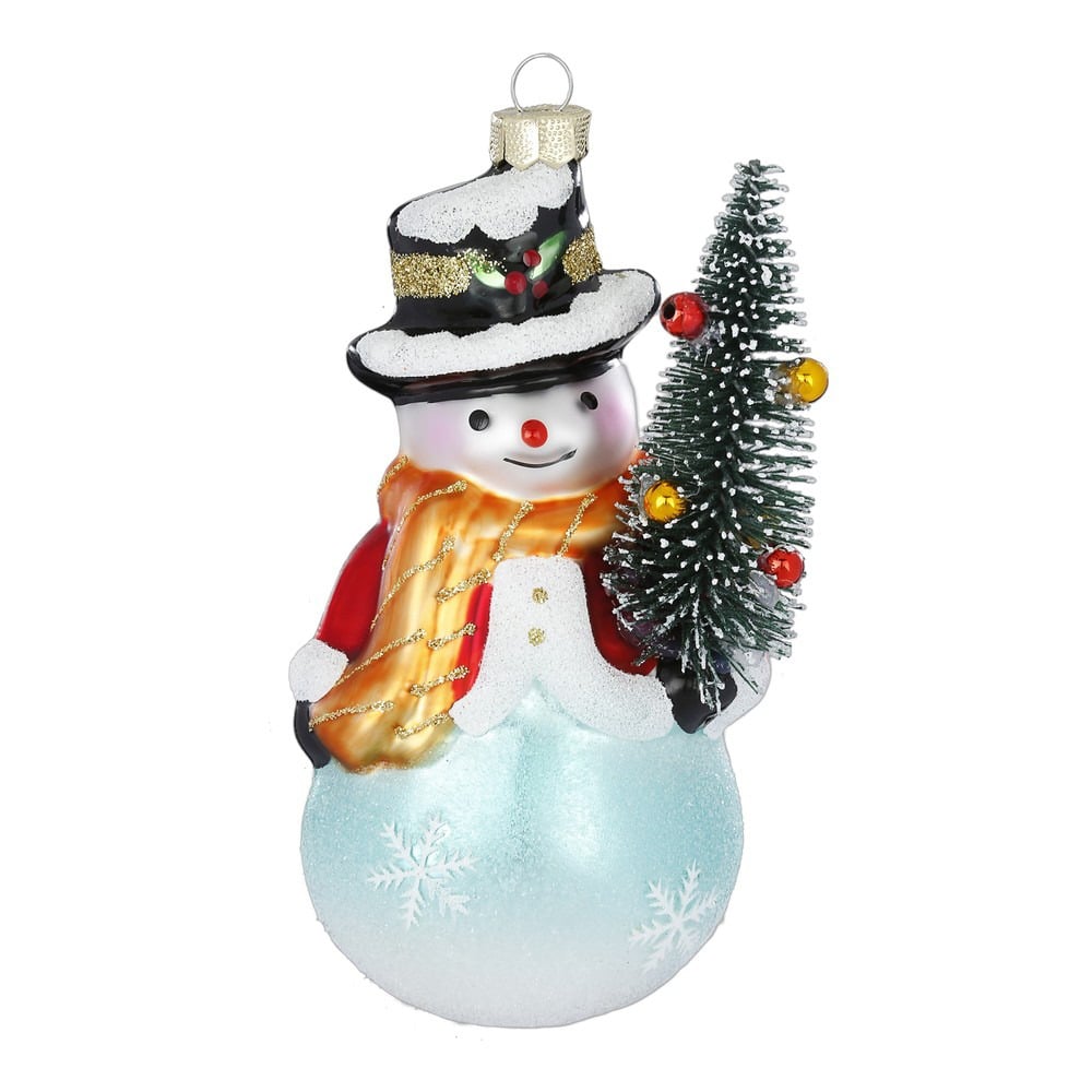 Snemandskugle med stor hat med dekorationer på, og i sin favn holder han et juletræ, der er pyntet med juletræskugler.