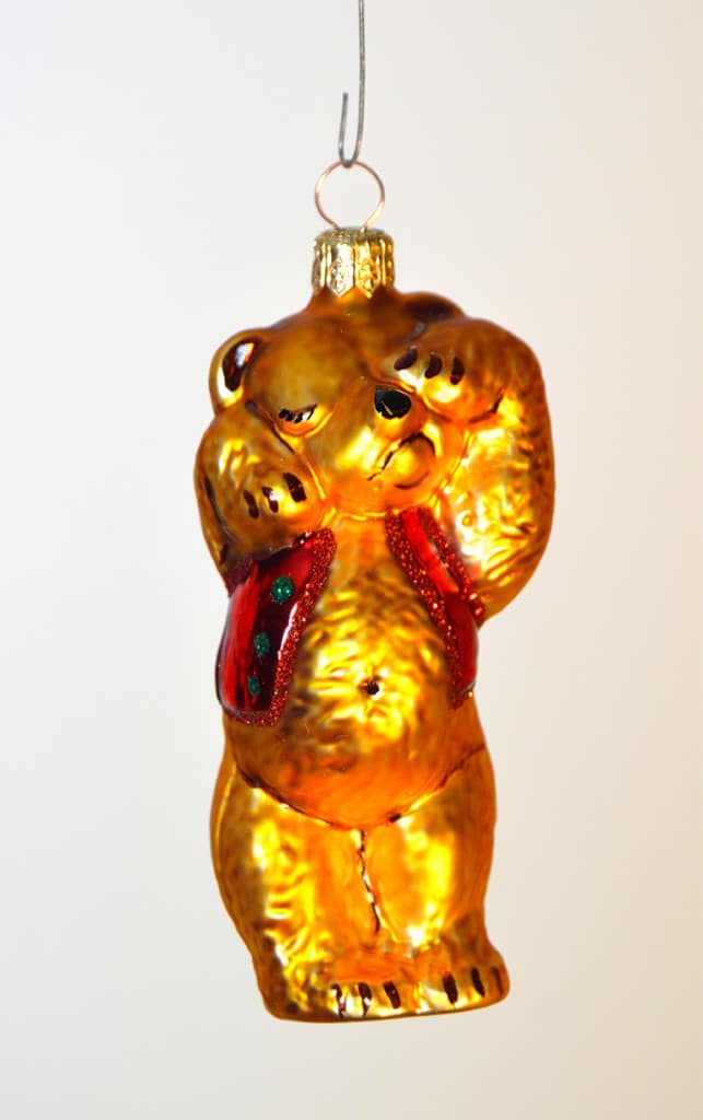 Unik smuk julekugle guldbamse, har en rød vest på, og er træt. Dette er en specielt mundblæst glas juletræskugle til juletræet.