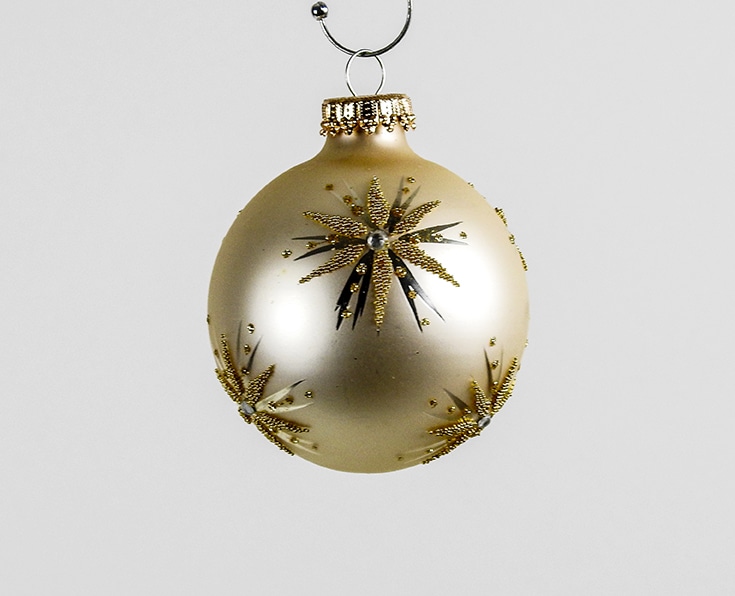 Meget smukke vanille silkematte glas juletræs kugler. Smykket med smukt guld glimmer stjerner, med sten i midten.